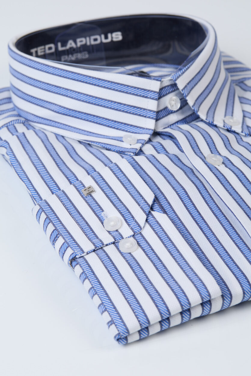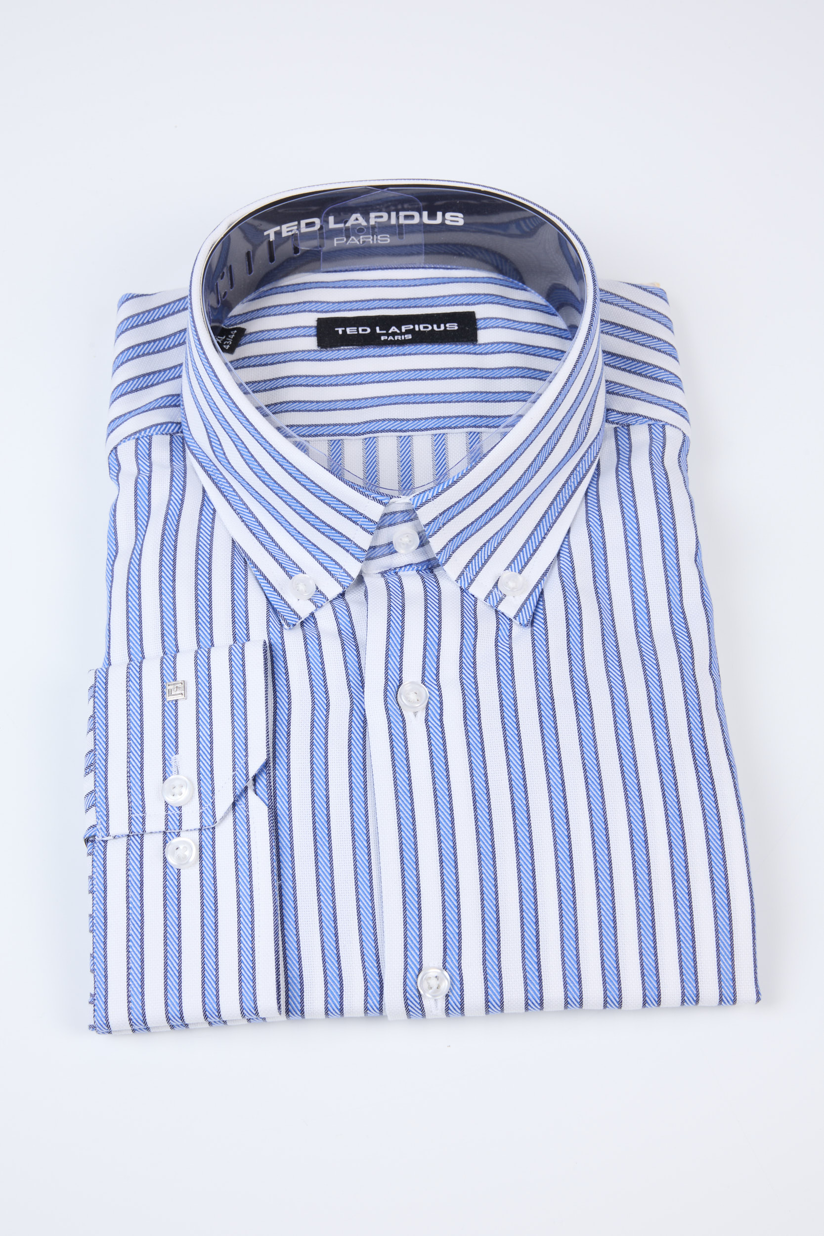 Элегантная мужская рубашка Ted Lapidus Paris выполнена в стильном дизайне с бело-голубыми вертикальными полосками. Контрастный рисунок визуально вытягивает силуэт и подчёркивает современный образ. Классический воротник с пуговицами придаёт модели аккуратность и делает её удобной для ежедневной носки.