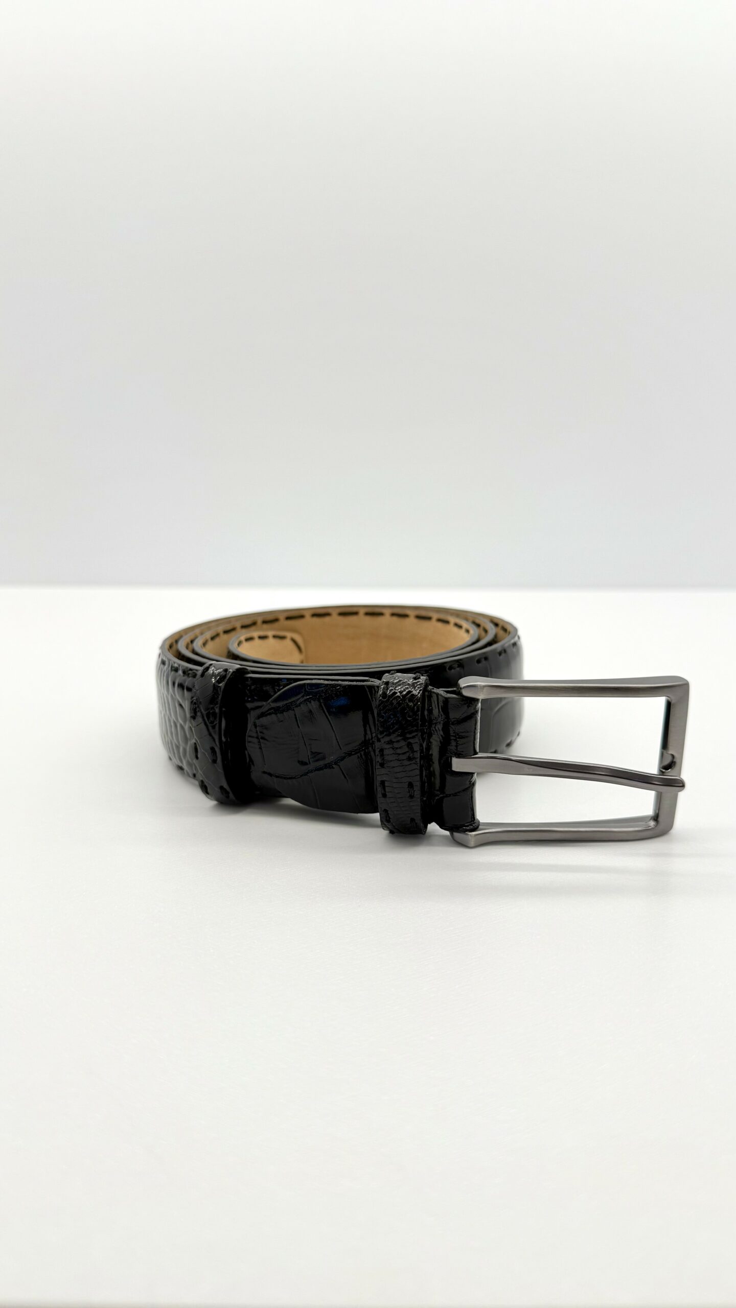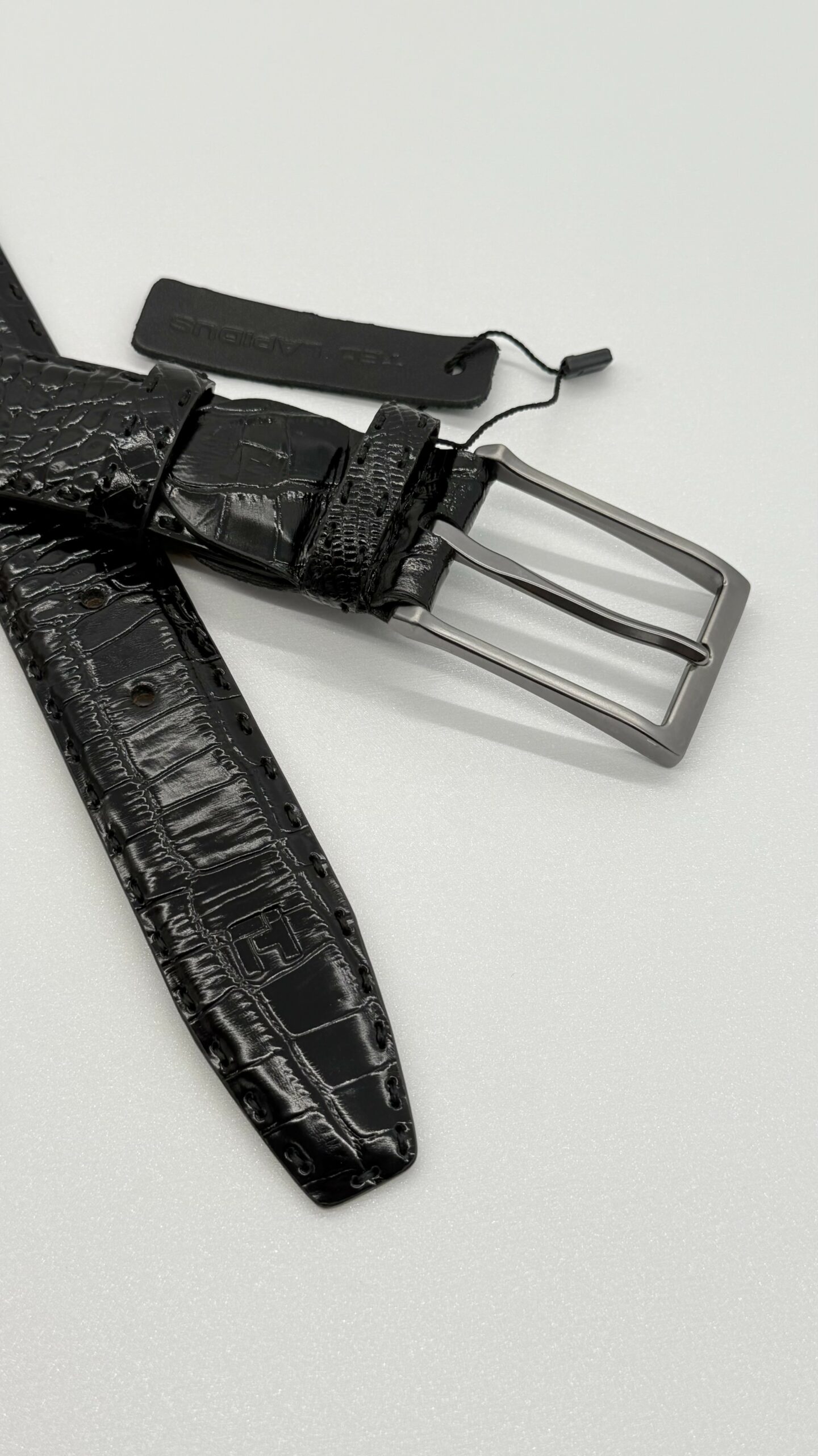 Мужской ремень из натуральной кожи с эффектной фактурой под крокодила. Классическая металлическая пряжка и качественная обработка делают его стильным и долговечным аксессуаром. Подходит для повседневных и деловых образов, добавляя элегантности и уверенности в каждом движении.