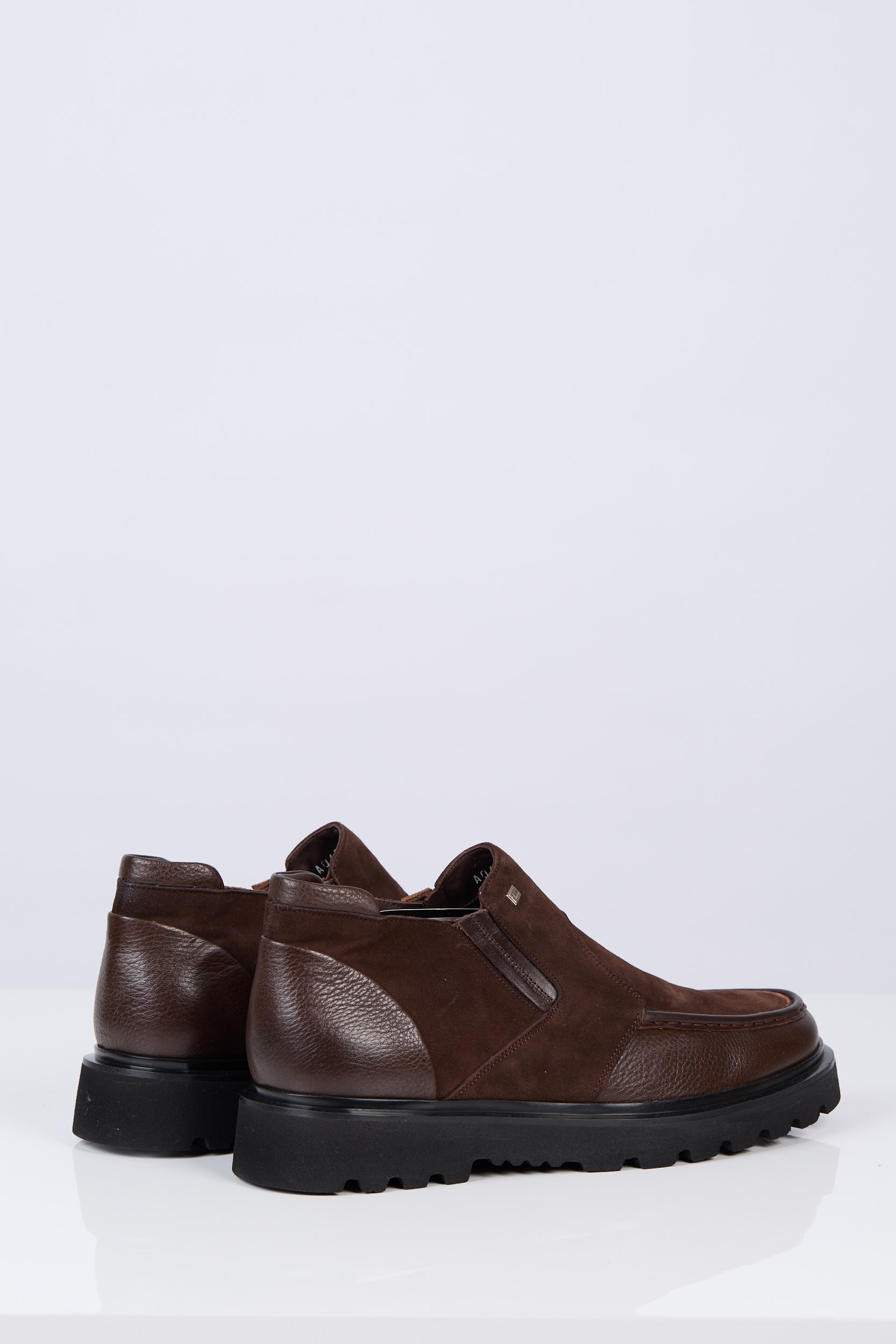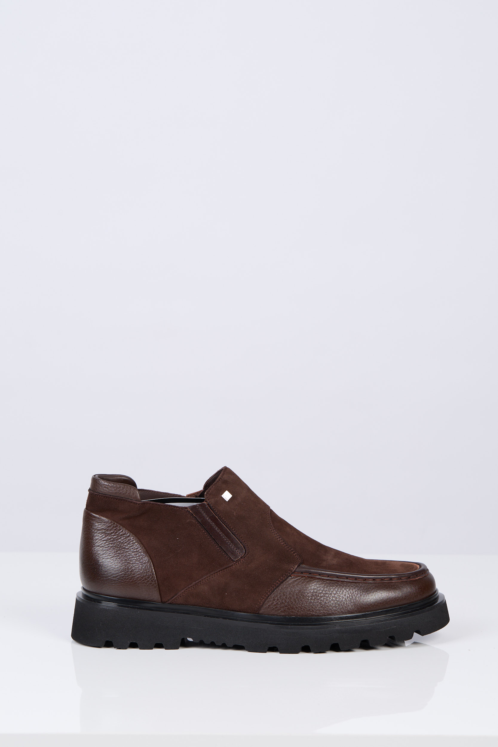 Ghete bărbătești realizate dintr-o combinație de piele naturală și piele întoarsă de culoare maro. Modelul fără șireturi, cu inserții elastice, oferă o încălțare ușoară și confortabilă. Talpa groasă cu profil aderent asigură stabilitate, iar interiorul moale oferă confort pe tot parcursul zilei. O alegere perfectă pentru sezonul rece și un stil urban elegant.