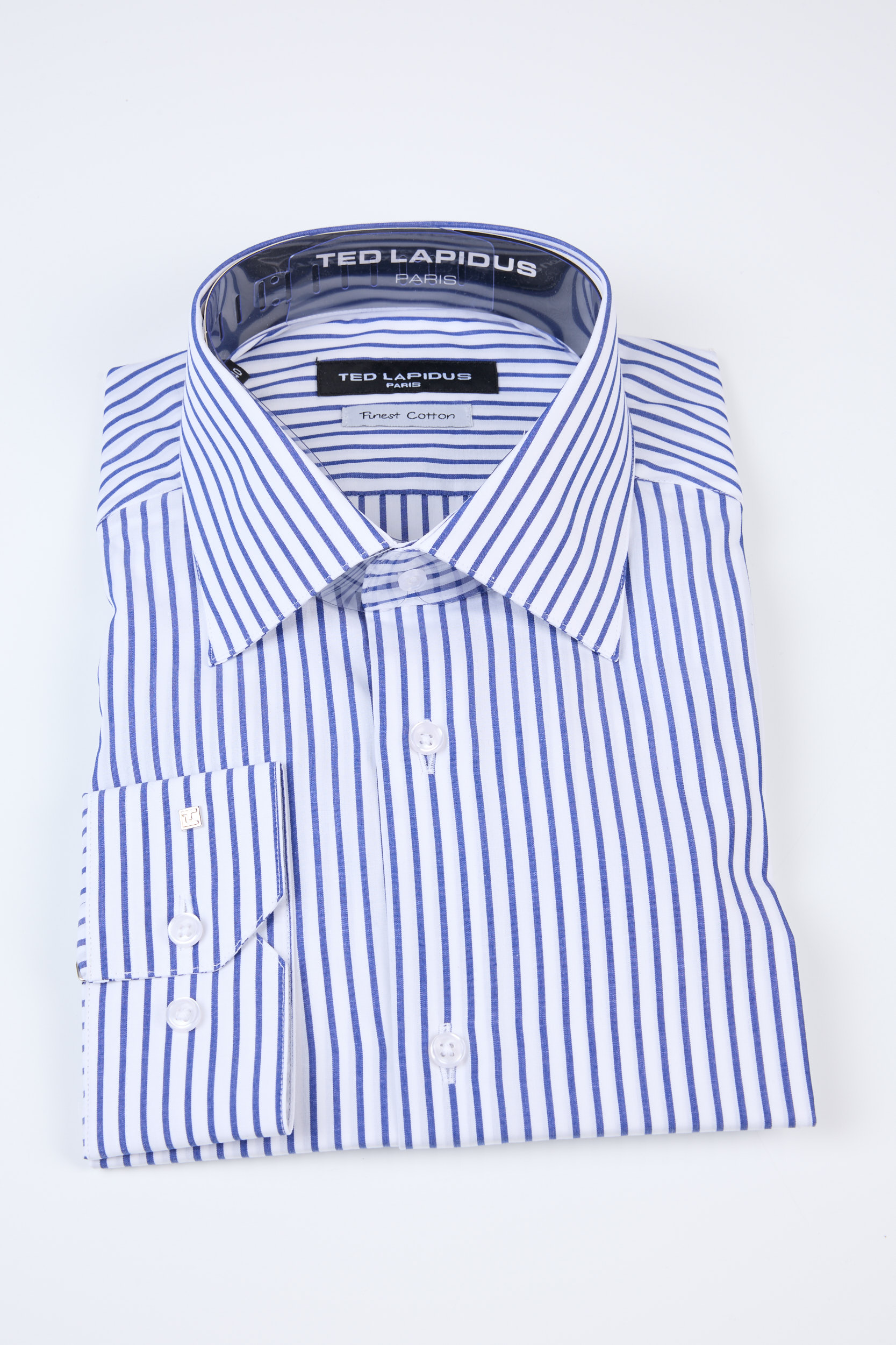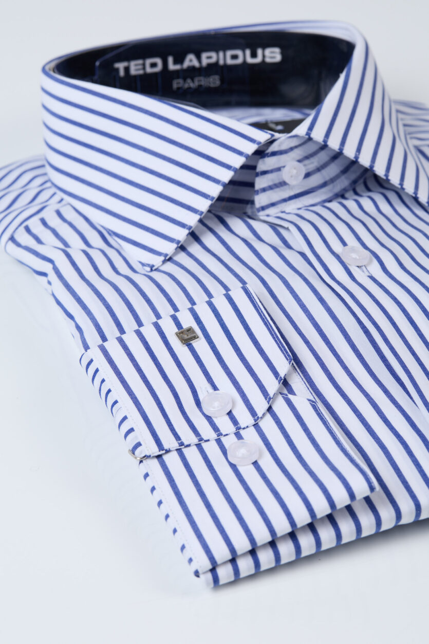Cămașă elegantă pentru bărbați Ted Lapidus, realizată din bumbac premium, cu bază albă și model rafinat în dungi albastre verticale. Liniile verticale oferă un aspect sofisticat și alungesc vizual silueta, adăugând eleganță și stil.