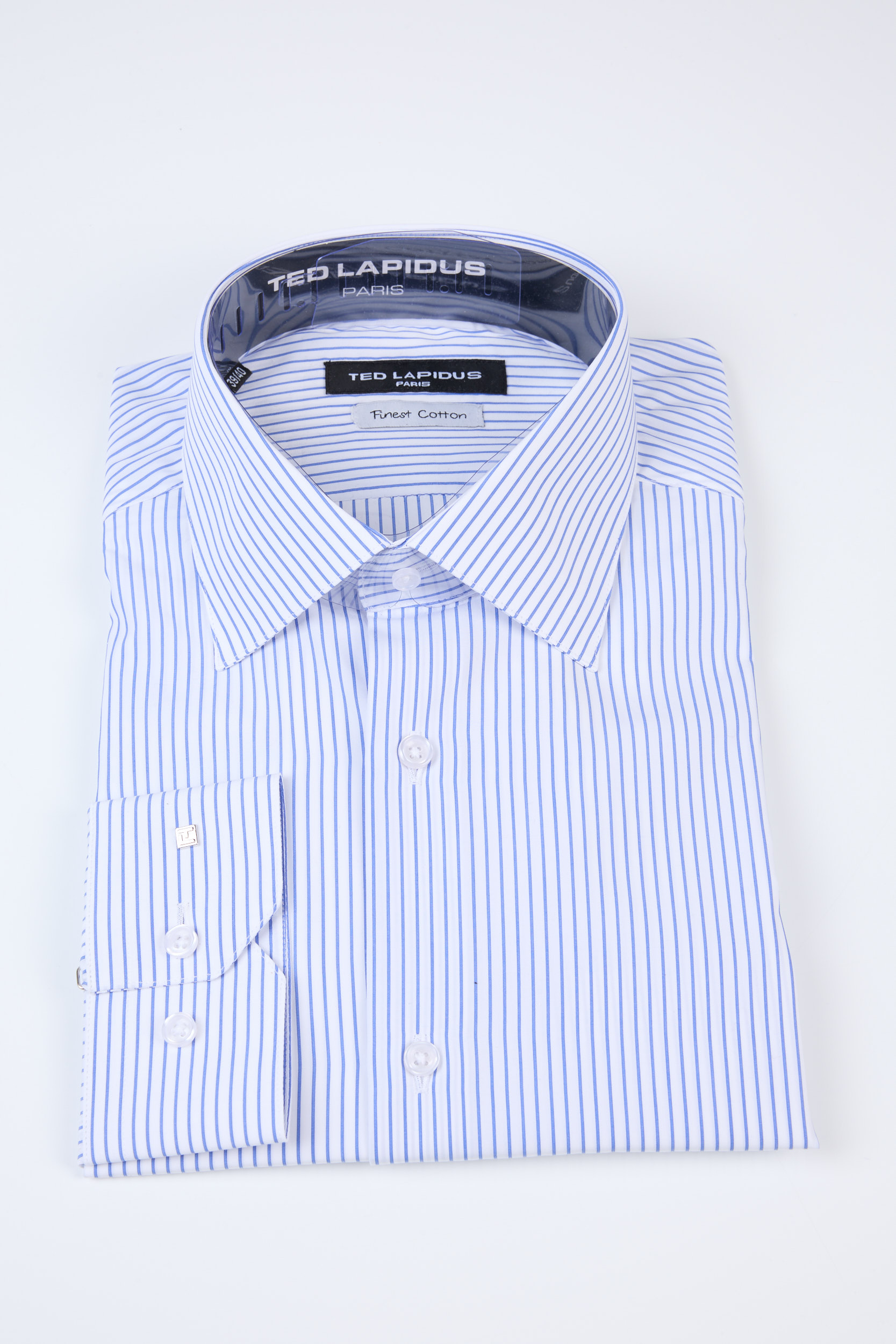 Cămașă elegantă pentru bărbați Ted Lapidus, realizată din bumbac premium, cu bază albă și dungi subțiri albastre. Liniile verticale fine oferă un aspect rafinat și alungesc vizual silueta.
