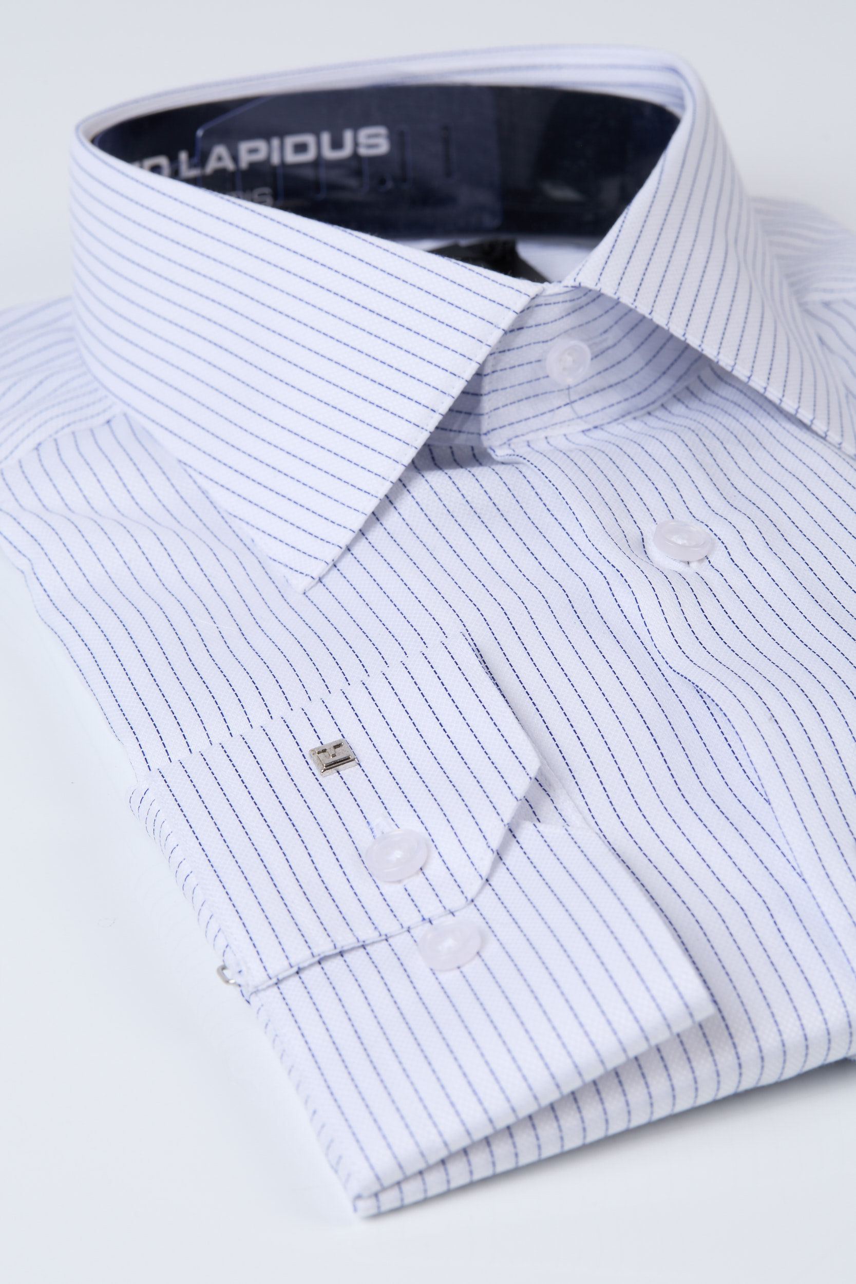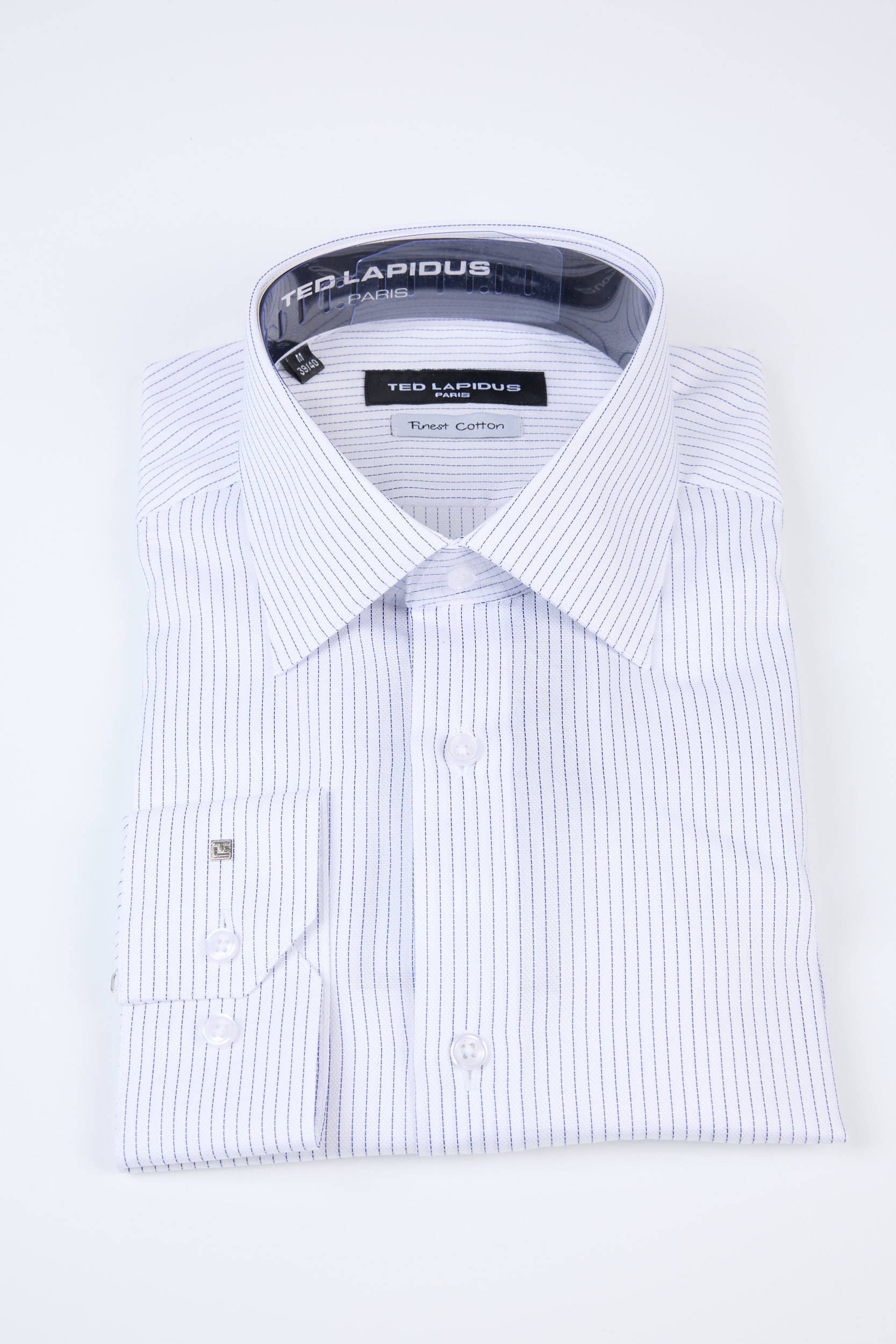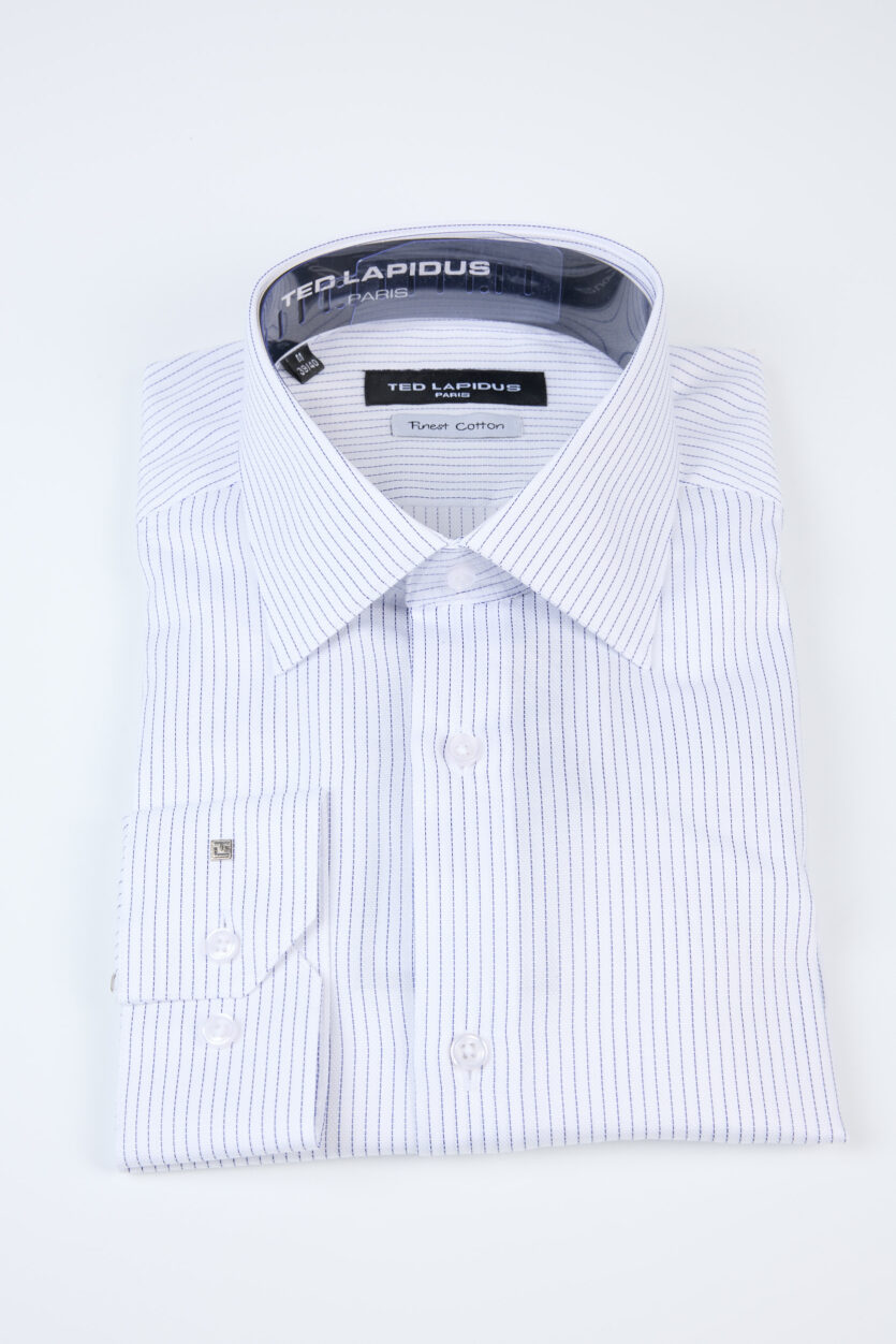 Cămașă elegantă pentru bărbați Ted Lapidus, realizată din bumbac premium, cu bază albă și dungi verticale subțiri de culoare albastru închis. Liniile fine conferă un aspect ordonat și rafinat, alungind vizual silueta.
