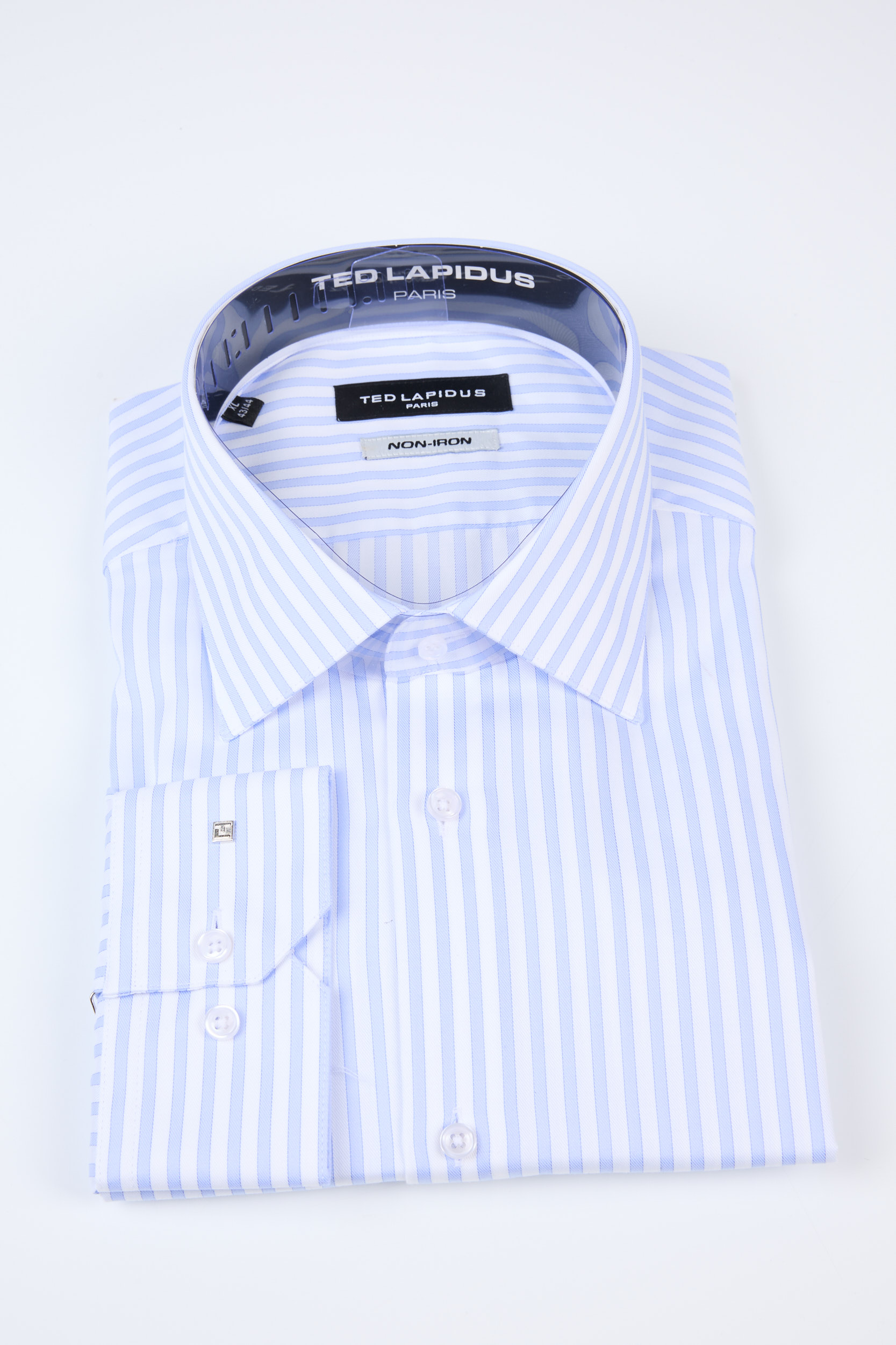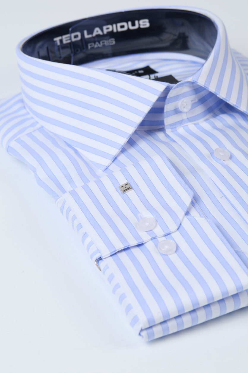 Cămașă bărbătească Ted Lapidus din bumbac premium, cu dungi verticale și tehnologie non-iron, care asigură întreținere ușoară și un aspect impecabil întreaga zi. Țesătura se șifonează mai puțin, fiind ideală pentru zile lungi și program intens.