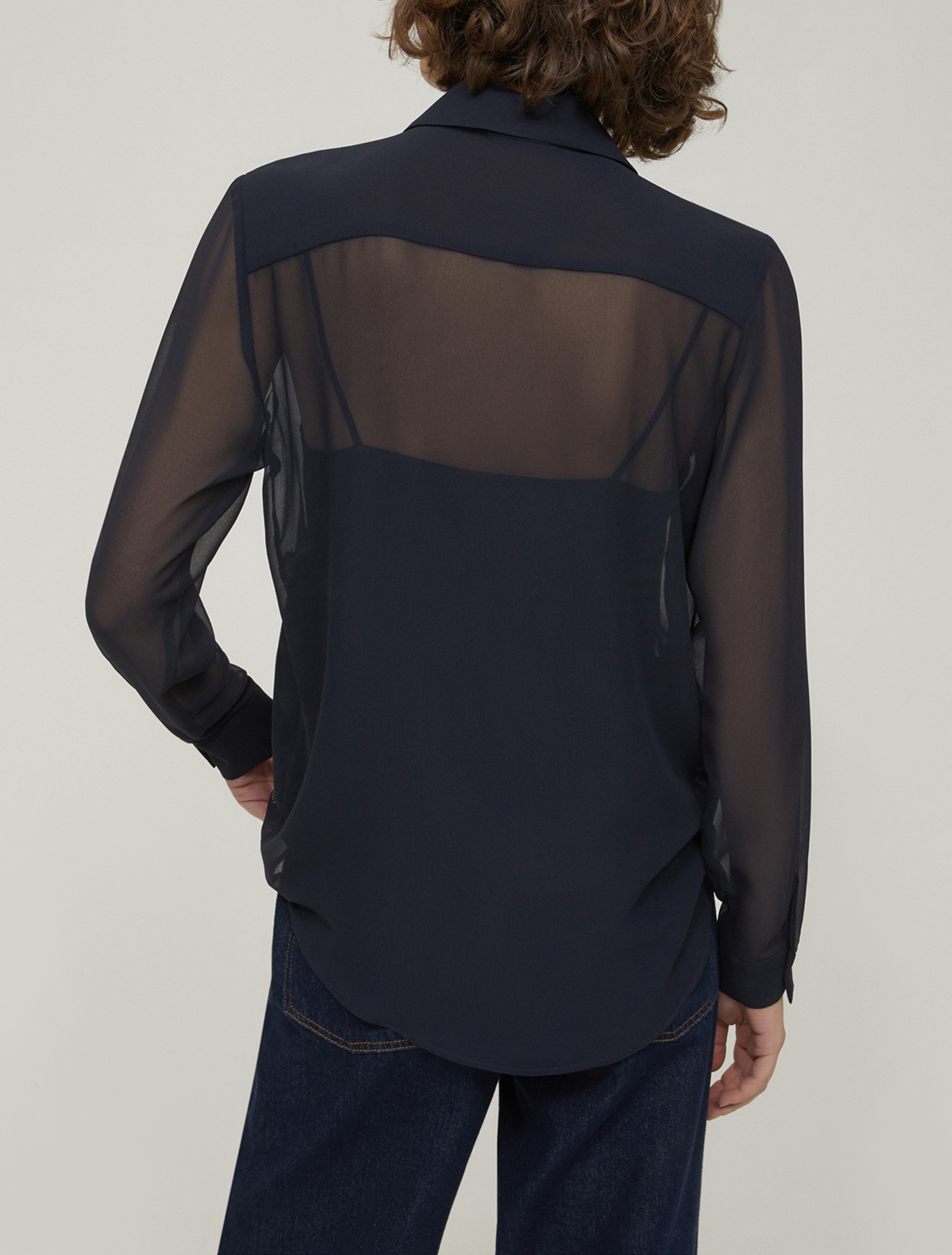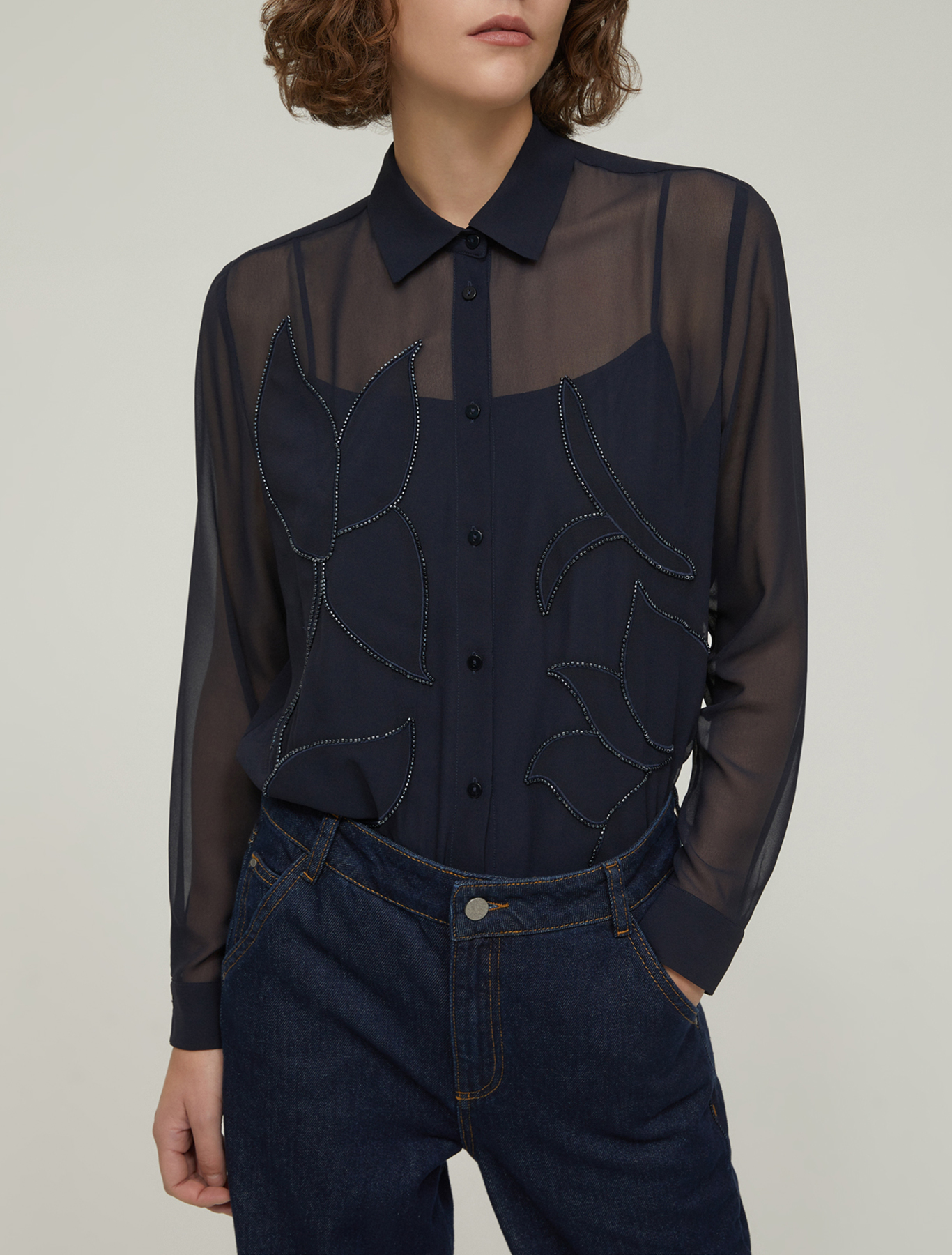 Bluza pentru femei cu mânecă lungă îmbină eleganța clasică cu detalii moderne. Țesătura semitransparentă creează un efect delicat și feminin, iar gulerul clasic și închiderea cu nasturi adaugă rafinament. Elementele decorative cu model subtil oferă un plus de stil și originalitate.