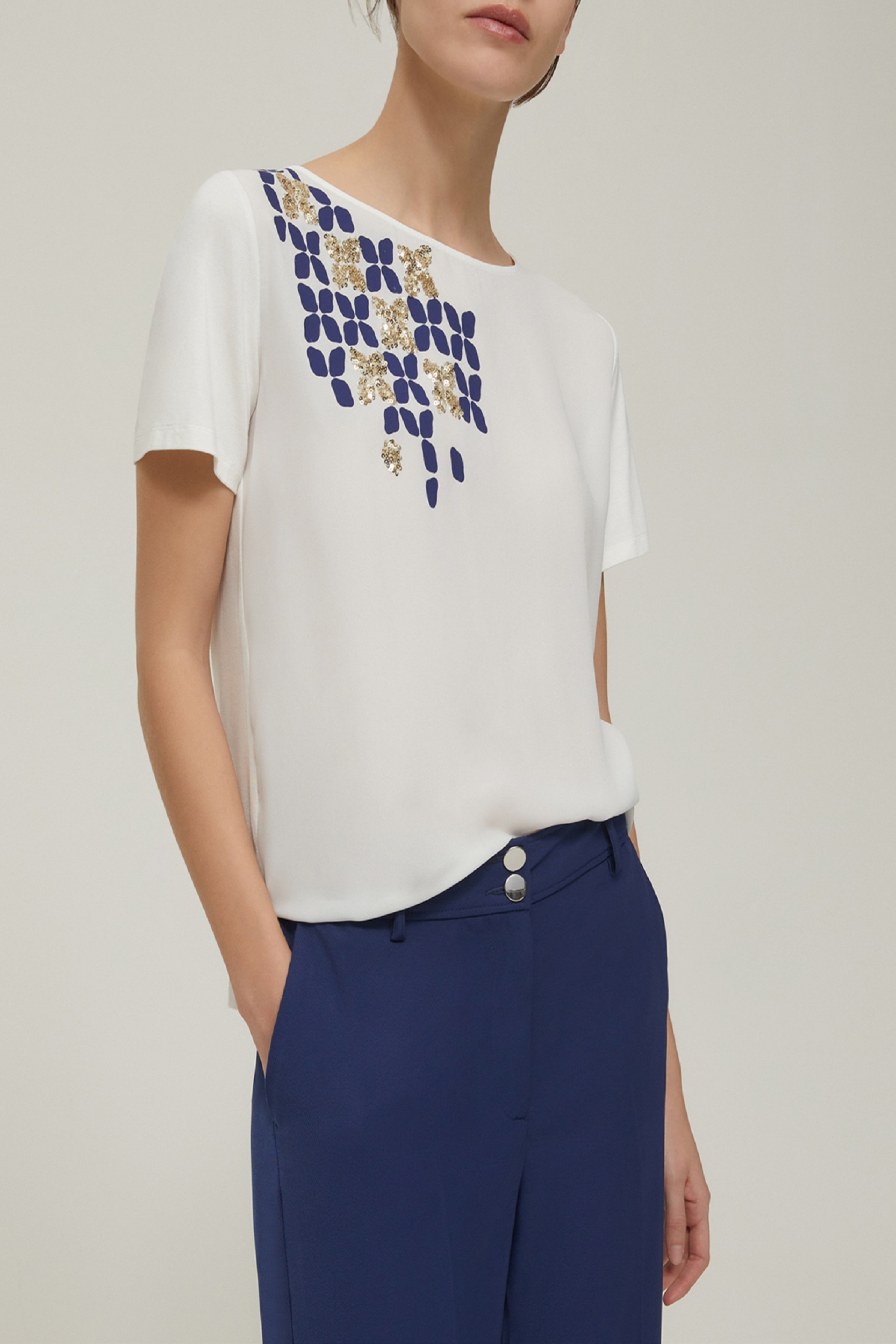 Bluza de damă cu mânecă scurtă și imprimeu decorativ este o piesă modernă și versatilă, potrivită atât pentru birou, cât și pentru ținutele de zi cu zi. Materialul lejer și plăcut la atingere oferă confort pe întreaga durată a purtării. Detaliile de design aplicate în partea superioară adaugă rafinament și eleganță, transformând bluza într-o alegere inspirată pentru orice garderobă. Se combină ușor cu pantaloni, fuste sau jeanși, completând un look feminin și actual.