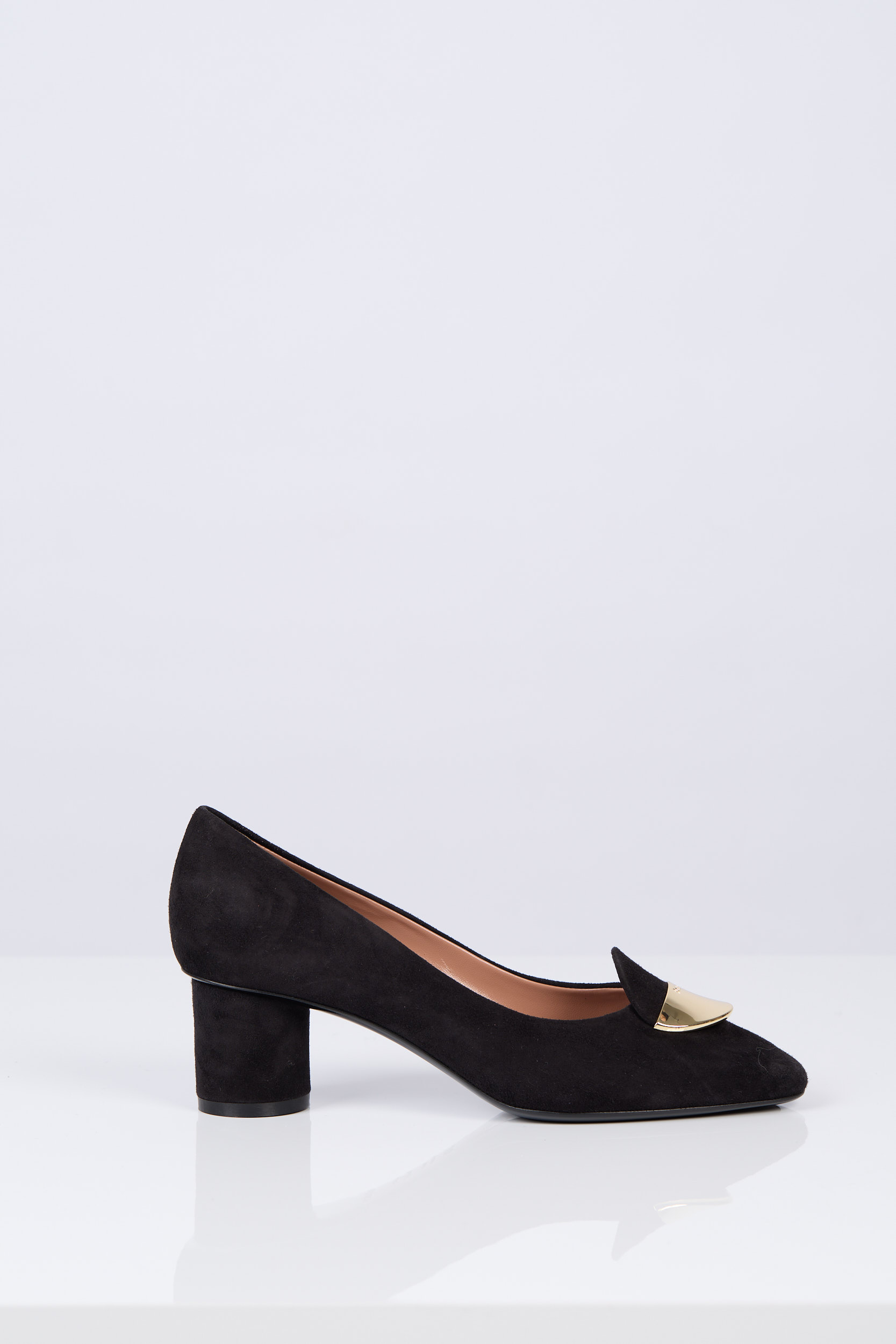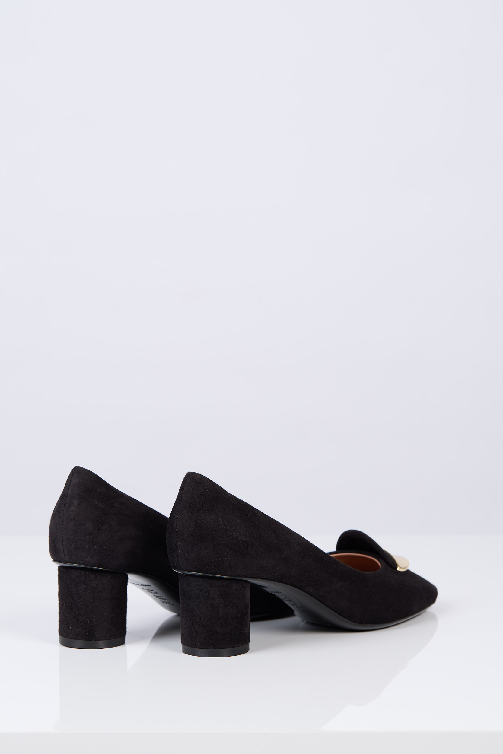 Pantofi eleganți din piele întoarsă cu toc stabil și detaliu metalic auriu. Designul rafinat oferă un aspect sofisticat, iar pielea moale asigură confort pe tot parcursul zilei. Perfecți pentru birou, evenimente sau ținute elegante de seară.